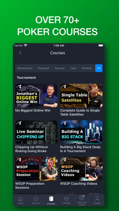 Master the game with Preflop GTO Charts, GTO Chart Trainer, Push/Fold Charts and Quizzes, Interactive Hand Quizzes, Video Classes, Webinars, Courses from top-level poker coaches with combined earnings of over $74 million.