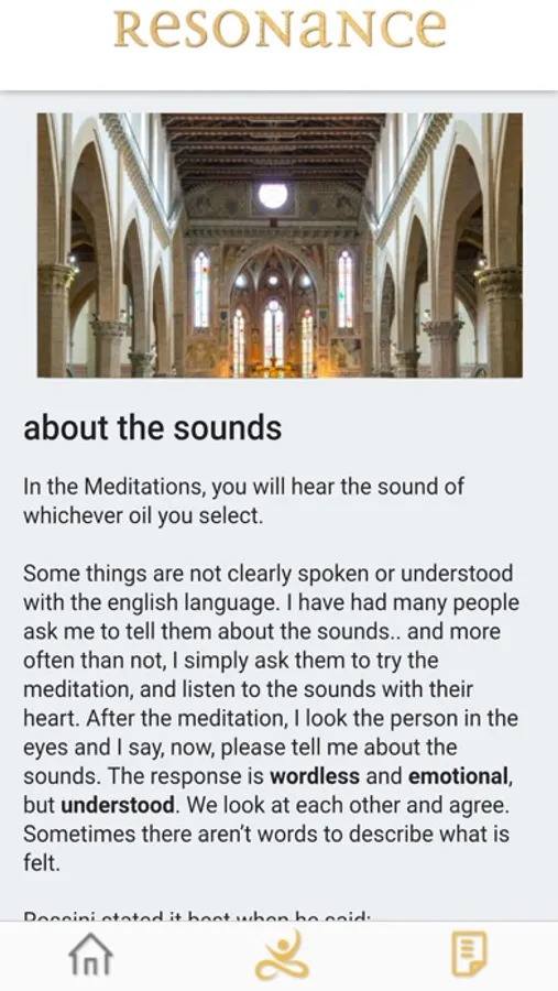Everything living has a sound! Each of the 12 sounds within the Resonance Meditation correspond to an individual essential oil. Each of the sounds/meditations are composed by hearing the "living frequency" or "resonance" of those essential oils. What you are hearing in the meditations is not a melody on the keys, it is the frequency or resonance of that living thing.