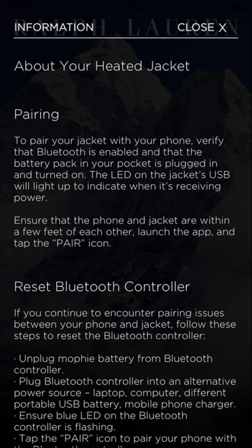 2. Open the RL Heat app and follow the prompts to pair your jacket with your phone via Bluetooth.