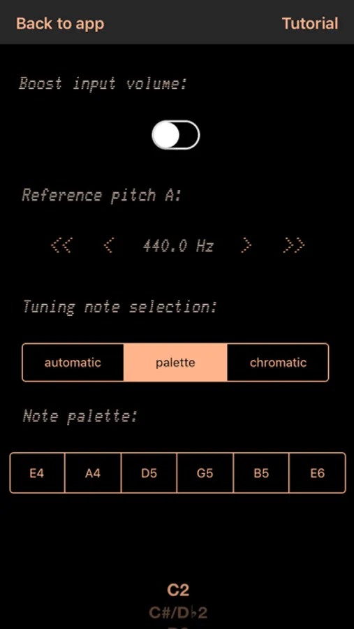When you manually select the tuning note, as opposed to letting the app detect it automatically, Helix Tuner is extremely resistant to background noise and higher string harmonics that confuse other tuners, causing them to jump around to higher notes and give wrong tuning information. Because the visualization system naturally responds more clearly to sounds near the selected tuning pitch, it is useful even when other musicians are playing nearby.