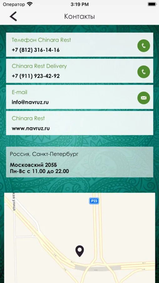 «Это нереально вкусно!!!» - так говорят про еду из нового ресторана Чинара на Московском проспекте 205 Б! Доставка блюд восточной и европейской кухни в Санкт-Петербурге займет не более 60 минут, а сам заказ — всего несколько нажатий! Быстрый заказ вкусной еды на дом и в офис станет проще с Chinara Rest , убедитесь сами! Свои предложения, идеи и замечания Вы можете отправить на адрес почты - info@navruz.ru