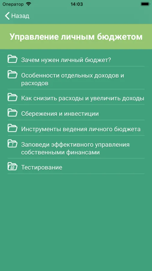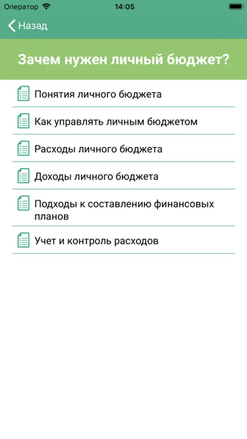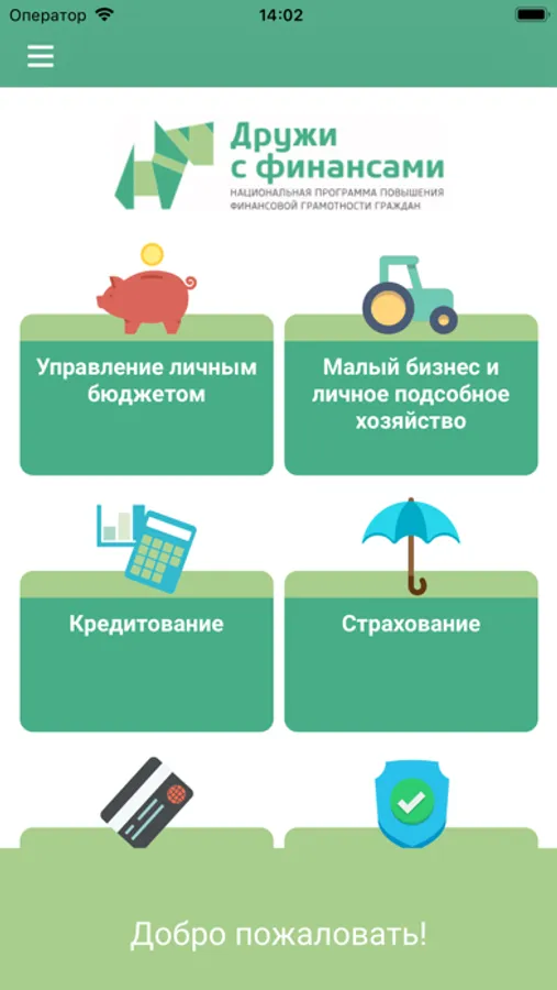 Мобильное приложение включает семь основных тем: личный бюджет, личные сбережения, страхование, кредитование, современные способы получения финансовых услуг, налоговые льготы и вычеты для физических лиц, малый бизнес и личное подсобное хозяйство.
