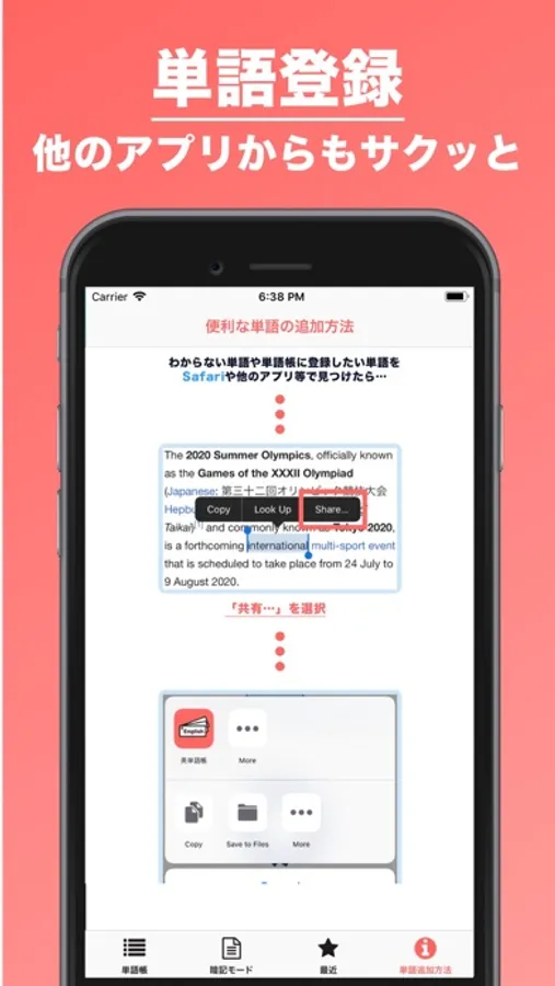 1つは、他のSafari等のアプリの共有ボタンから、単語を選択して、そのまま追加する方法です。記事等を読んでいて、分からない単語があったらサクサクと追加しましょう。
