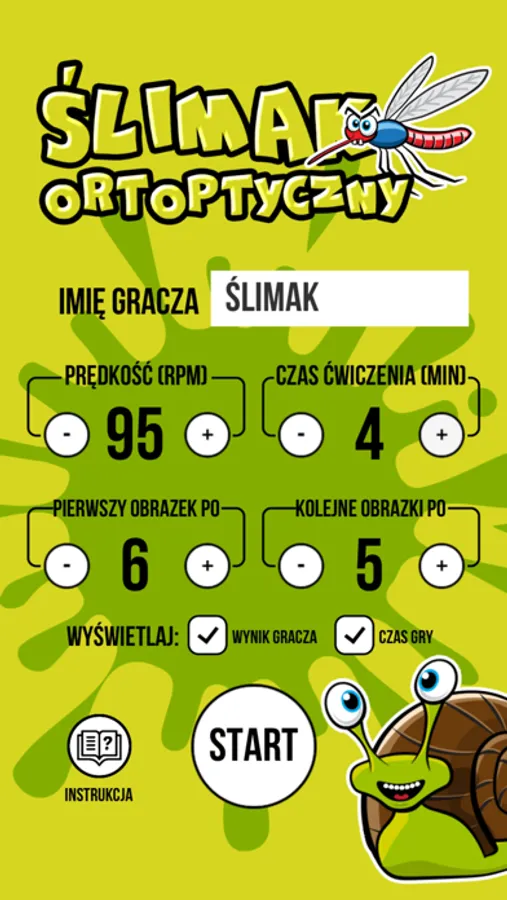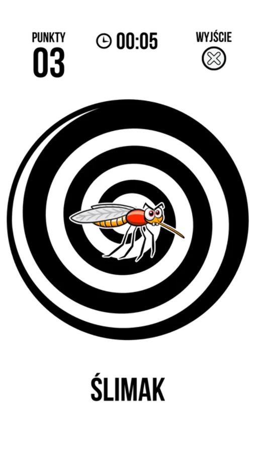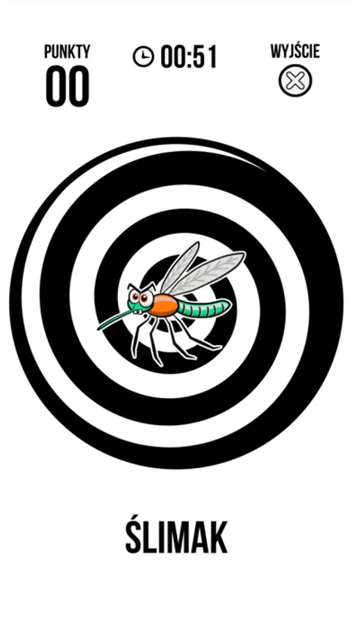 Zadaniem ćwiczącego jest trafienie komara, który pojawi się na środku tarczy i zebranie jak największej liczby punktów. Uważaj na ślimaki, one zabierają punkty!