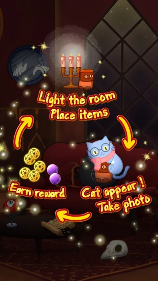 Let's find all the "Magic Cats" hiding in this mansion. And help breaking the curse to restore their memories as a withces and wizards again!