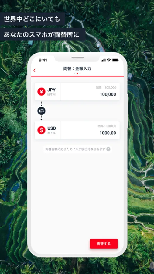 アプリから好きなタイミングで即時かつリーズナブルに両替可能です。旅の途中に、わざわざ両替所を探す必要はありません。