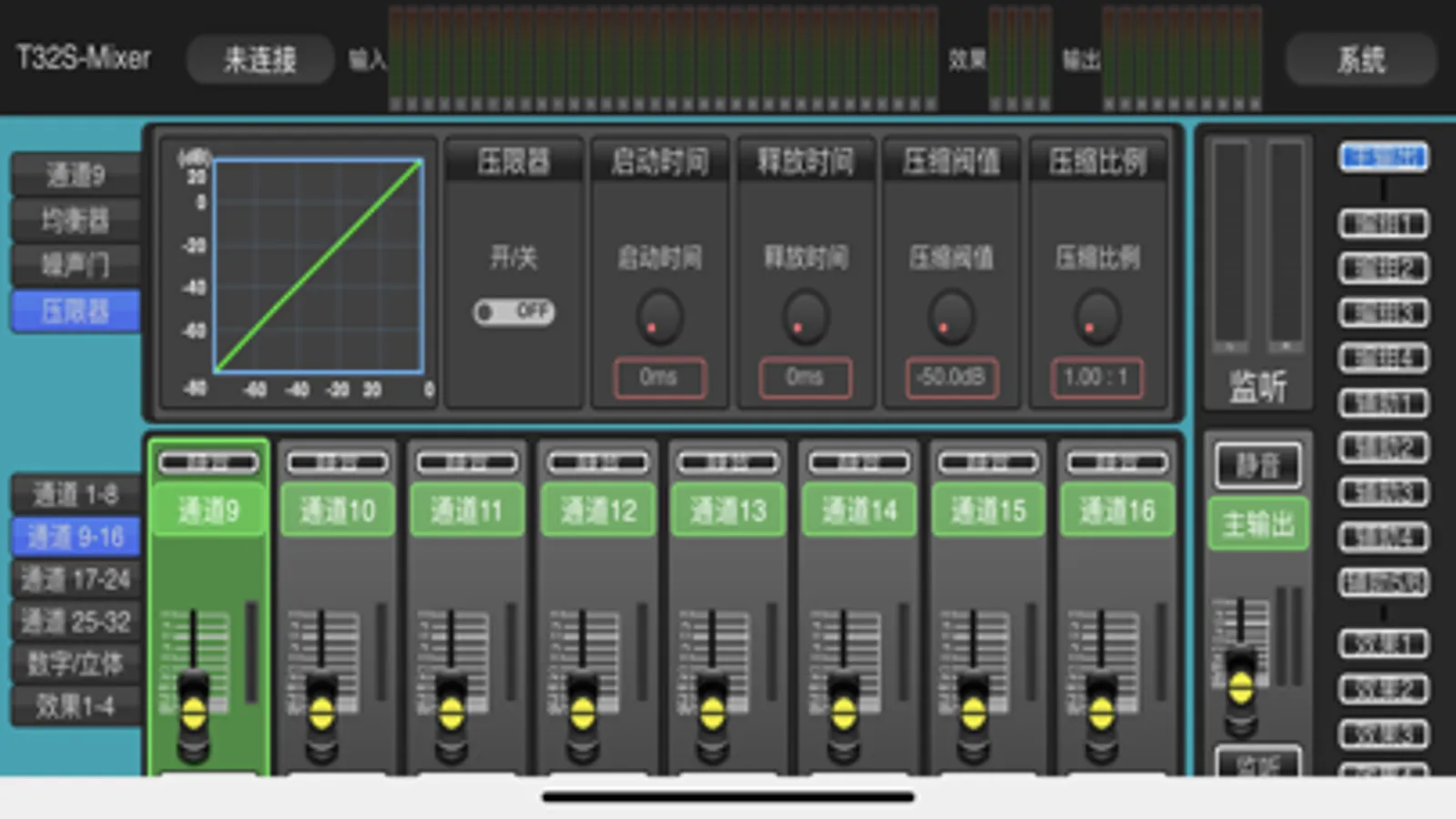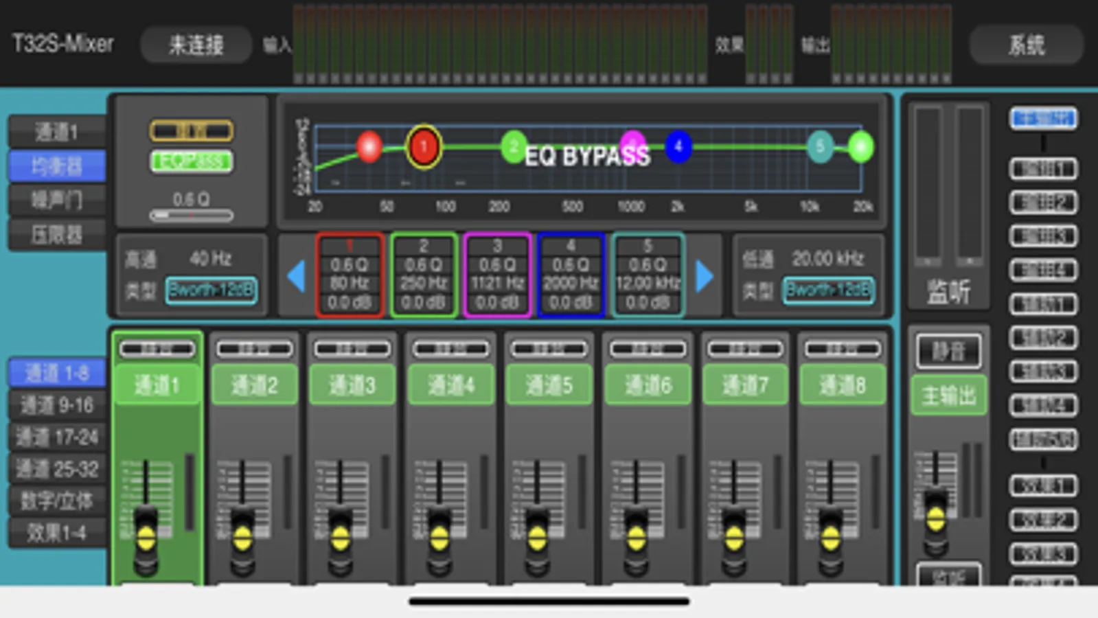 •输出处理:高低通滤波,15段参数均衡,压缩器,延时,相位