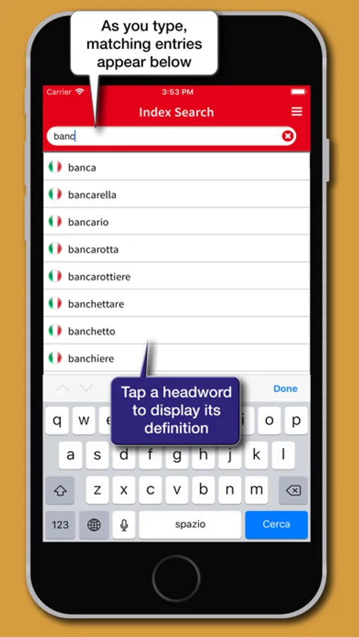 • Index search: displays in alphabetical order the headwords that match the characters typed in the search box
