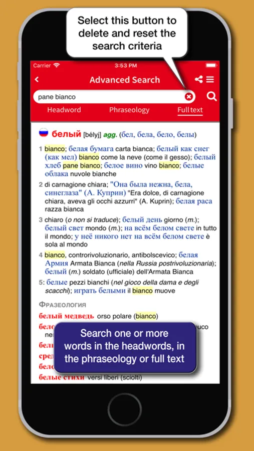 • Advanced search: lets you search for headwords, in the phraseology, and in full text
