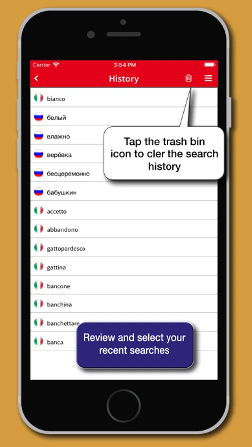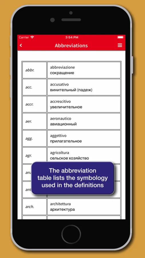 The app's interface has been redesigned to provide a simpler and more intuitive experience. Each definition can be shared using the features available in the device, such as social media, e-mail, SMS, cloud. A main menu that can be activated via an icon available at the top right of the screen enables all the features of the app: