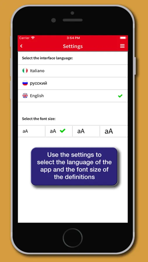 • Settings: allows you to choose the font size of the definitions and the language of the interface