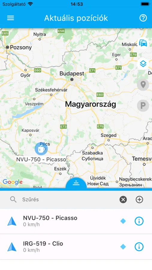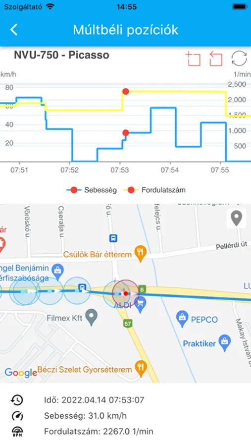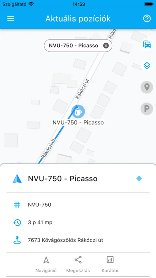 - követhető egy kiválasztott jármű helyzete és mozgása