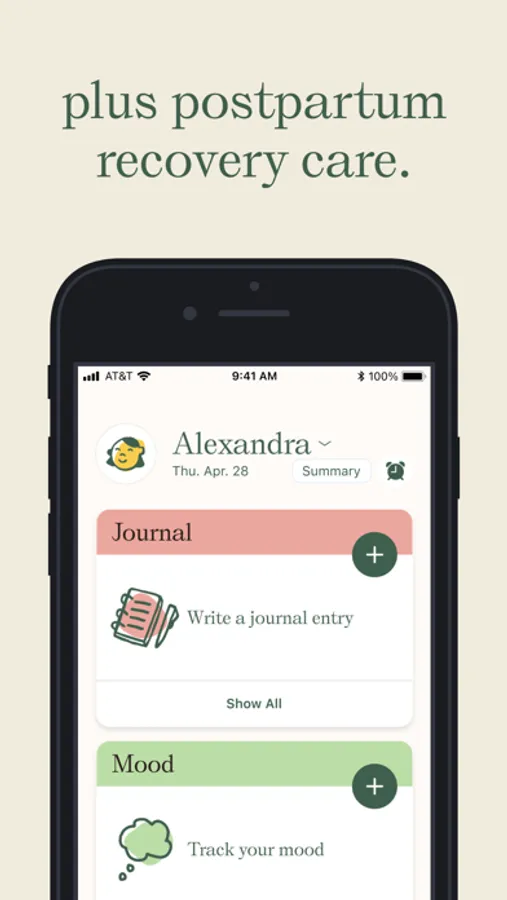 - Track postpartum recovery directly in the app. Keep track of medication immediately after delivery and water intake, sleep, mood, and journaling throughout your postpartum journey.