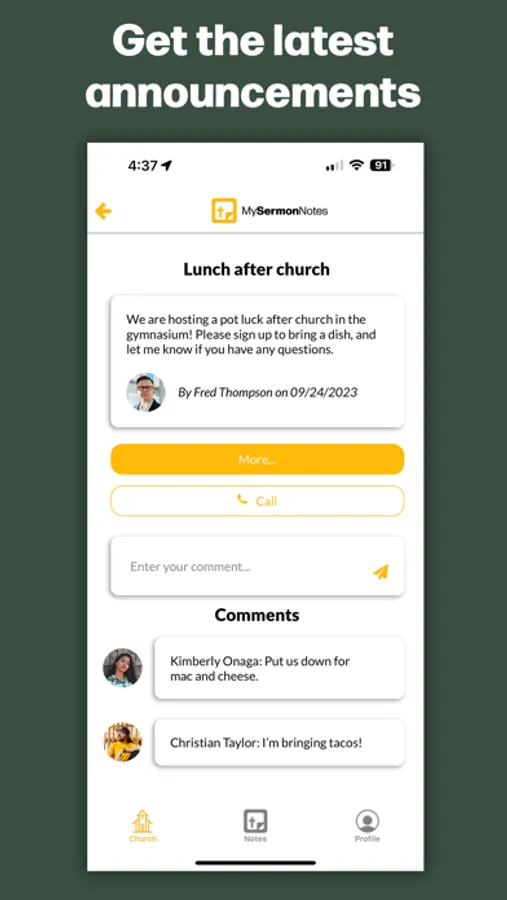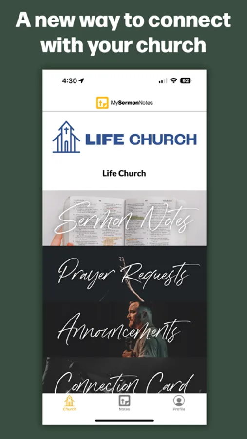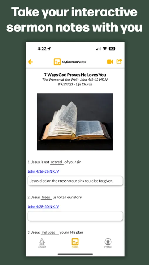 Take interactive, fill-in-the-blank sermon notes at your church with My Sermon Notes. You can also interact with your church in other ways, including prayer requests, announcements, and more.