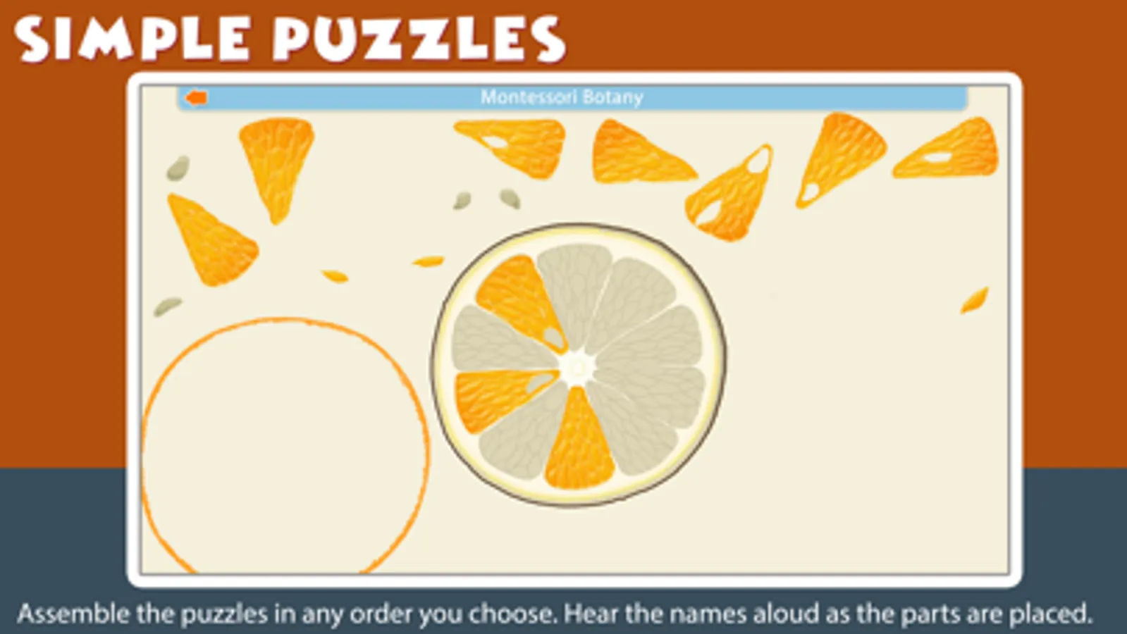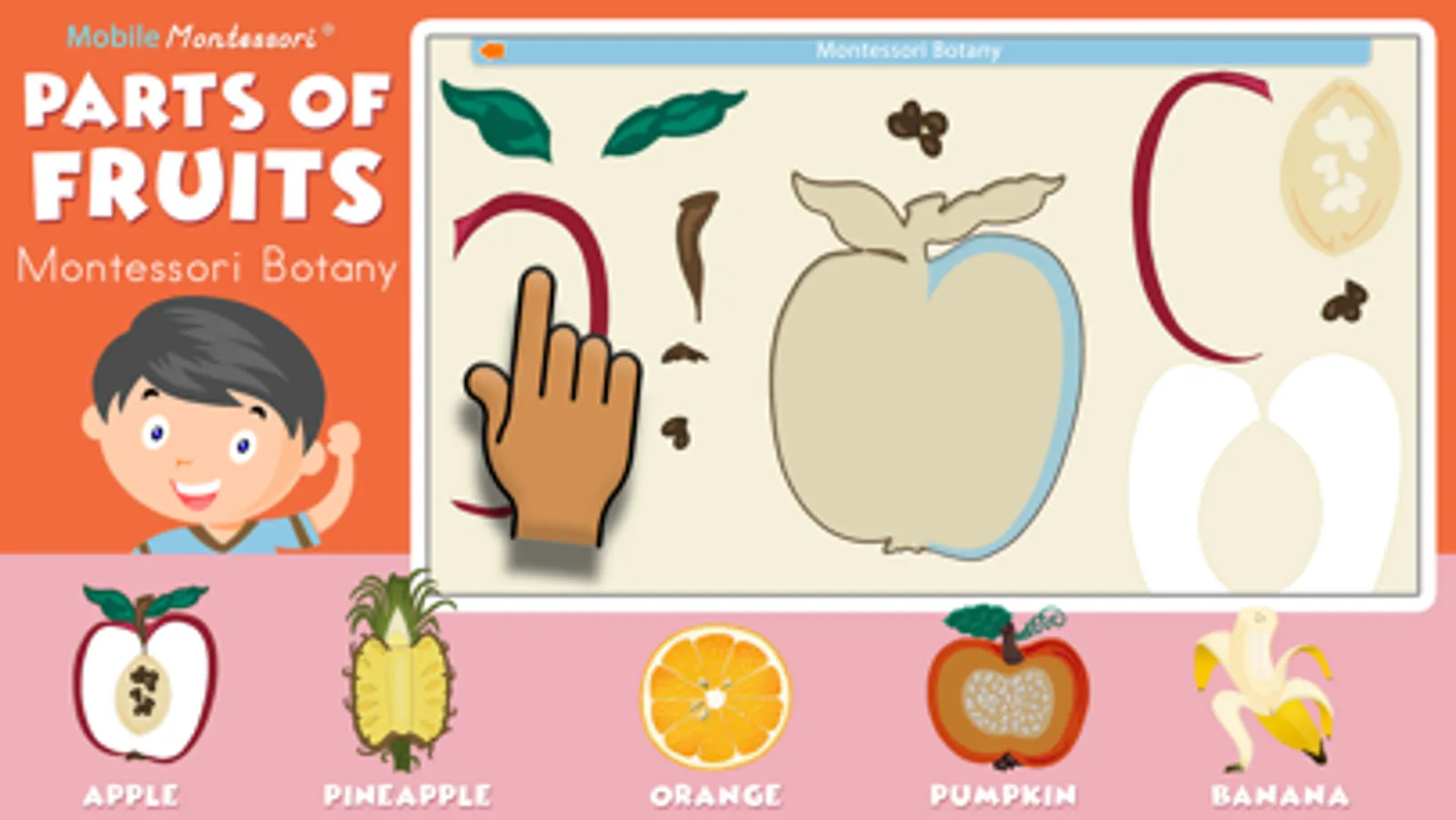 Parts of Fruits is a Montessori Preschool & Kindergarten science app to learn the makeup of five different fruits: Apples, Oranges, Bananas, Pumpkins, & Pineapples.