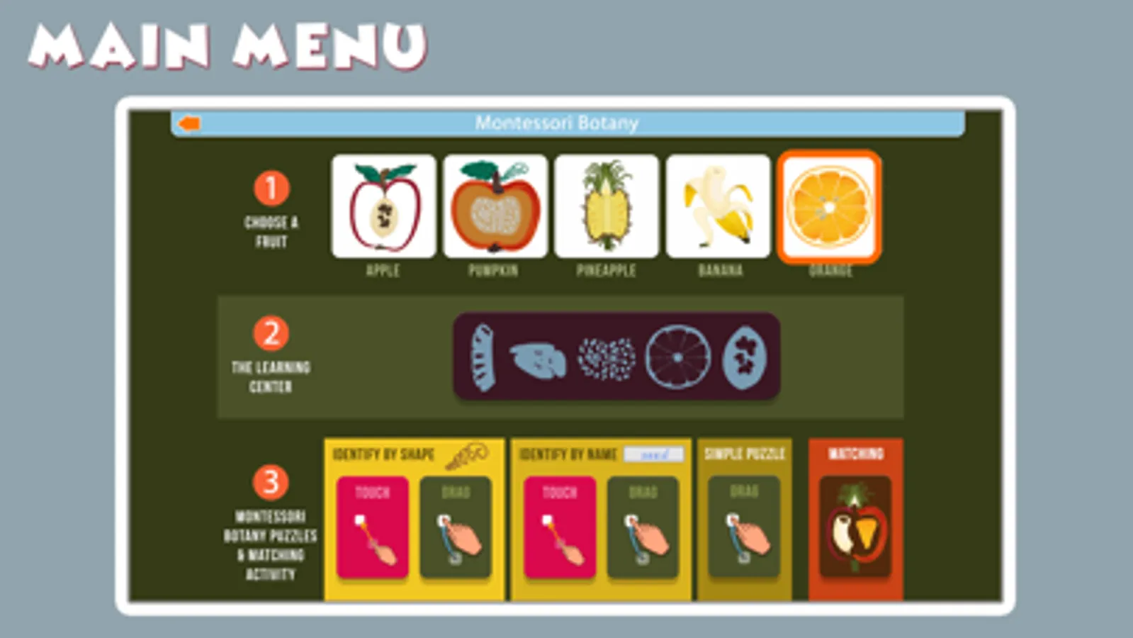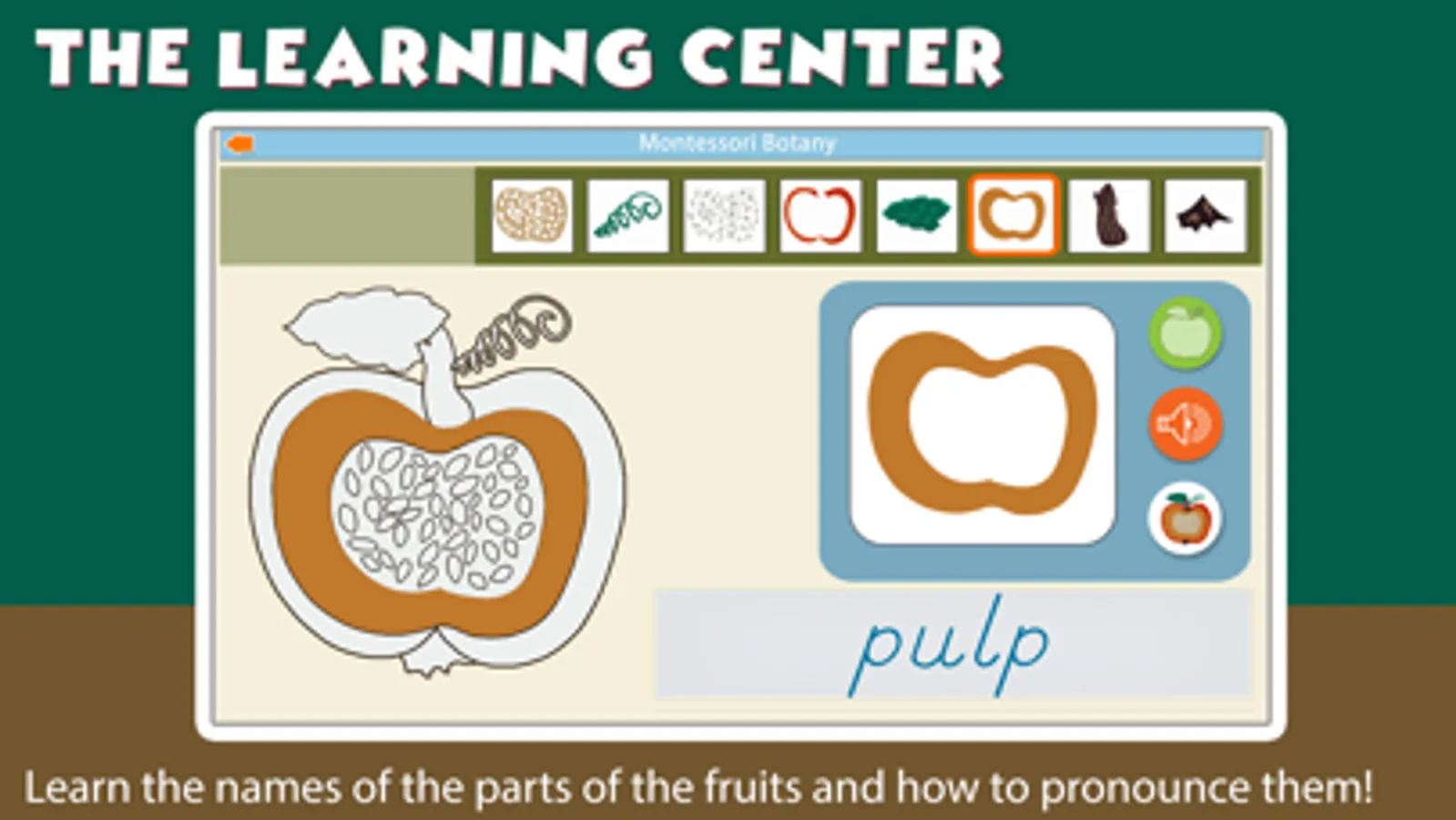 The activities begin with the Learning Center, where you will be introduced to the different parts of the fruit, what they look like, what they are called, and how to pronounce the names.