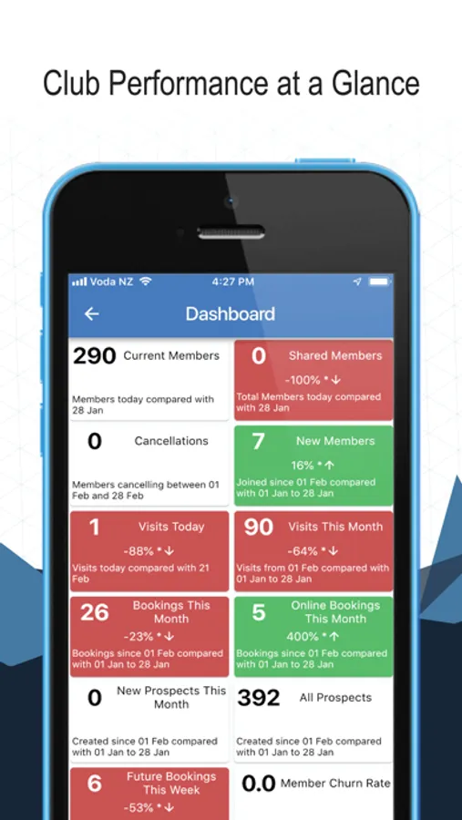 The Dashboard shows important club statistics at a glance - memberships, visitation, bookings & more.