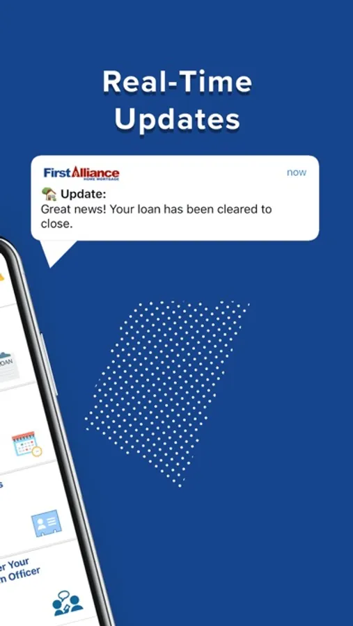 The First Alliance Home Mortgage mobile app allows consumers, real estate agents and loan officers the ability to track their loan, receive real time updates and submit conditions via their mobile device. Users are able to verify loan information and status, receive push notification reminders for important dates (appraisal, loan commitment, closing, rate lock etc.), initiate a chat and remain engaged from origination to close.