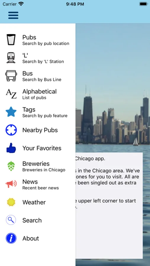 Search by neighborhood, 'L' station, bus line or the pubs nearest to your current location.