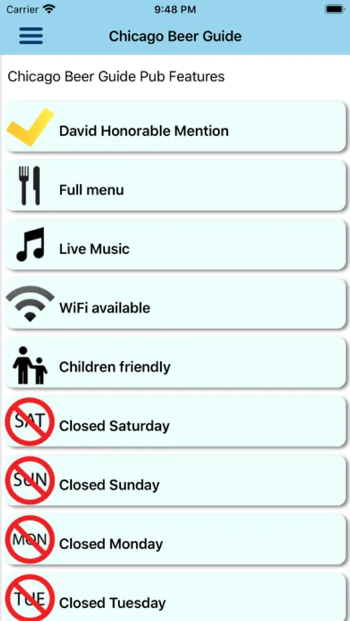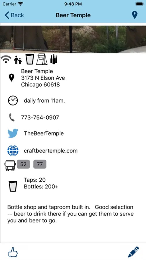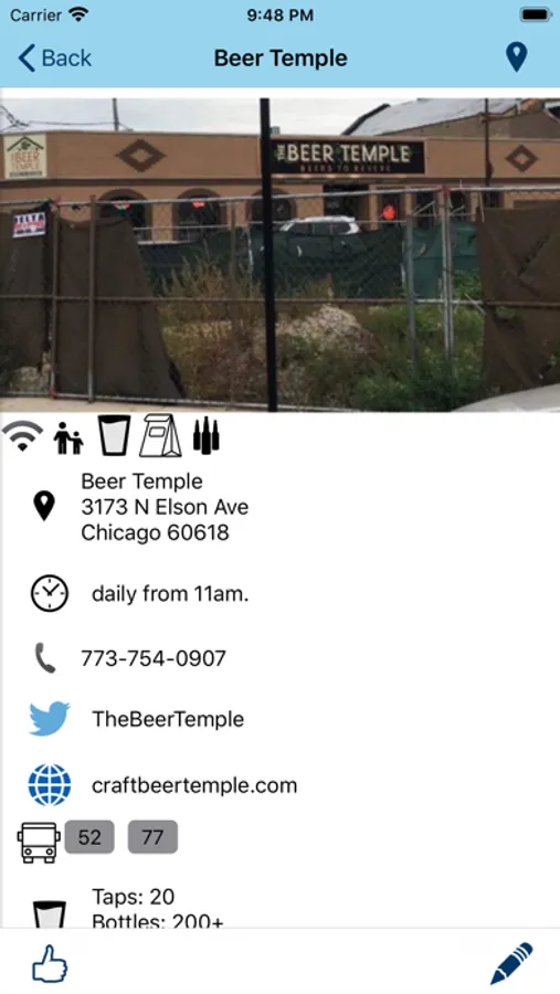 Each entry contains a review, photograph, nearest public transportation, contact info, website and twitter handle for each pub. Check the pub's twitter feed for news without leaving the app. A map will show the location of the pub as well as nearby listed pubs.
