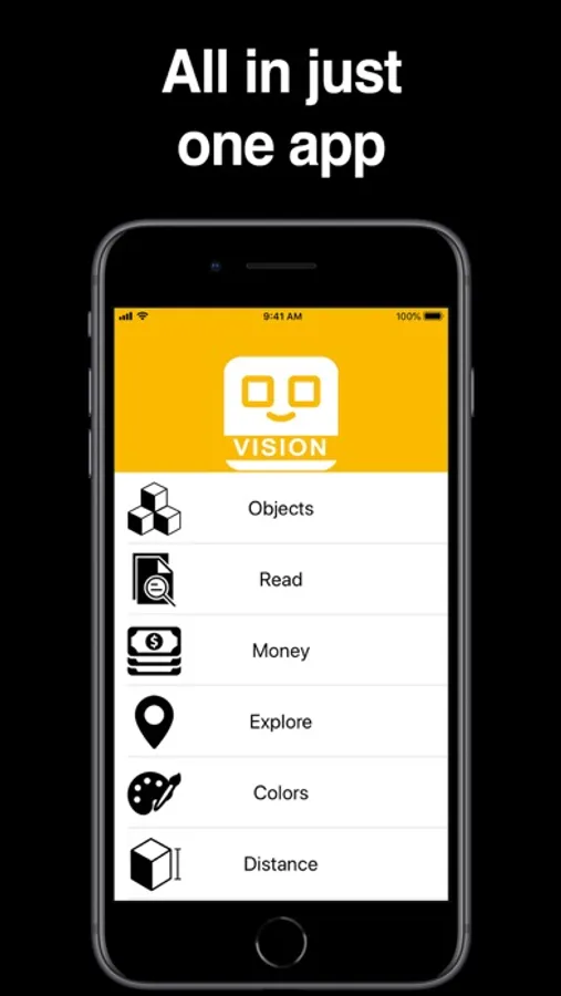 Vision uses Artificial Intelligence in real time to identify objects, money, colors, approximate distances, read text and more; all through your phone's camera. It's optimized for working with VoiceOver in 35 languages. First, please verify that your phone is not muted. Then, when you choose one feature, move the camera slowly in some directions to scan your surroundings. Vision has 7 features: