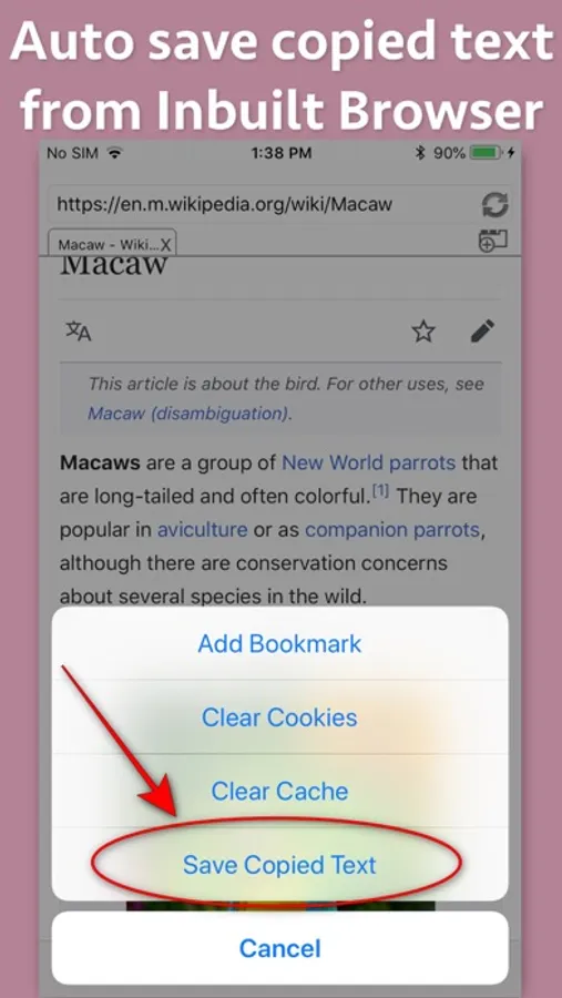 The application also comes with inbuilt web browser. Using it, you could copy the text and save it along with the current URL being browsed directly from the browser.