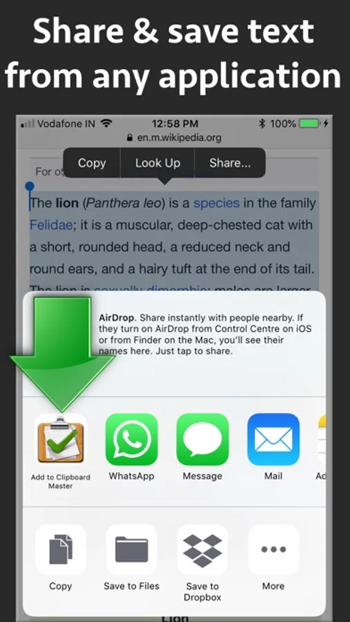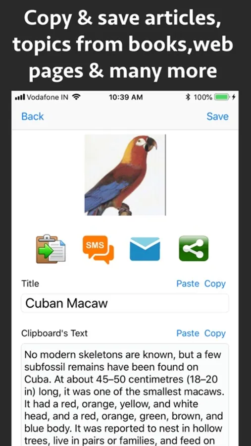 Clipboard Master helps to resolve these issues by storing thousands of copied text. All you need to do is to Copy the text from any application like Safari or Mail. Once the text is copied, just open “Clipboard Master” and it will automatically add the copied text as a new record. You could also select a Text or Image from any application and “Share” it with the application. This helps to quickly add text or image without leaving the working application. For example, if you are reading a document and need to save a paragraph, just select the paragraph and share it with “Clipboard master”. This will save the selected text to the application without leaving your present application. Alternatively, you could also copy the text and open Clipboard Master to automatically save it. Once the record is added to the application, you could also add Images, URL, website addresses and additional notes to the records as per the requirements.