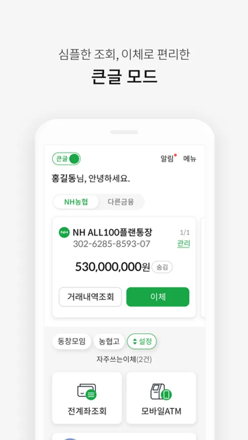 - 메인화면에서 큰글모드로 설정하여 조회, 이체를 큰글씨로 이용하실 수 있습니다.