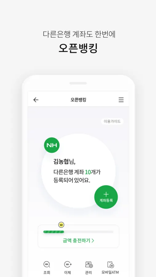 - 다른은행 계좌의 잔액을 농협계좌로 충전할 수 있습니다.