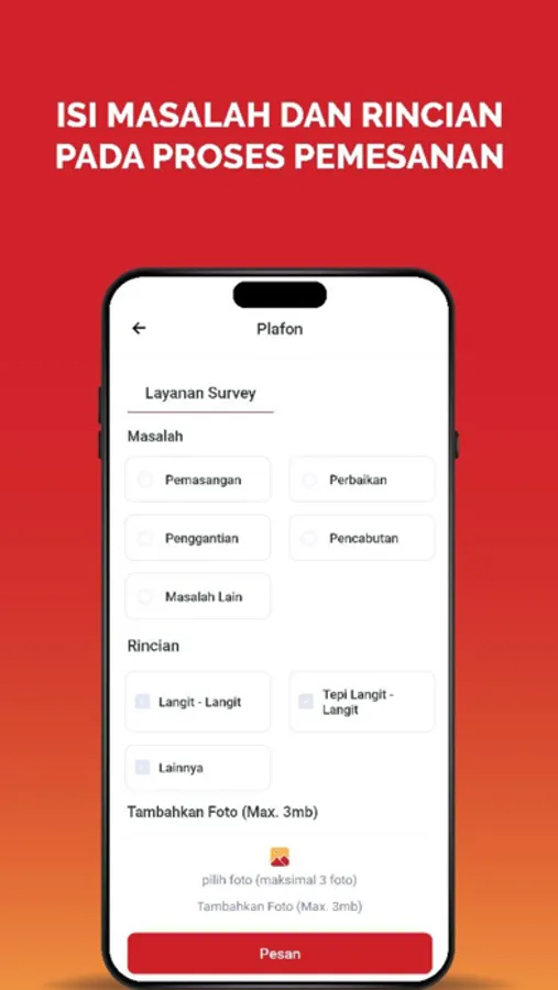 Melalui aplikasi yang mudah digunakan, Anda hanya perlu memilih layanan tukang yang Anda butuhkan, membuat janji dan selesai! Tukang/AHLI akan datang, melakukan survei gratis dan memberikan Anda penawaran yang terperinci. Anda pun bebas berdiskusi langsung dengan AHLI mengenai harga, bahan baku, dan waktu sesuai dengan kebutuhan Anda.
