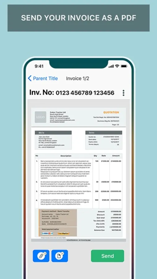 • Create and send invoices as PDF attachments via email