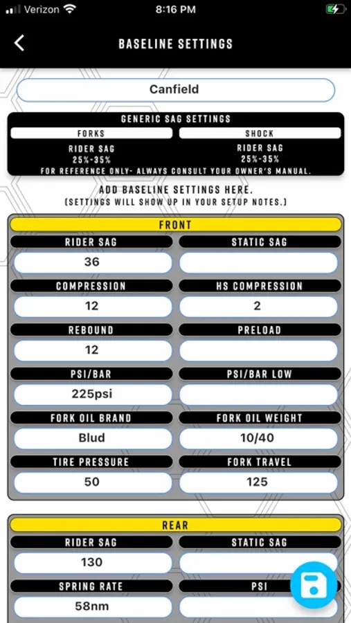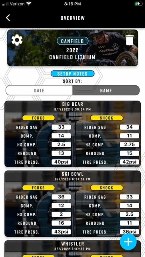 -Add clicker settings, sag settings and make additional notes for different rides, tracks and conditions.