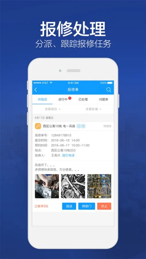 管理人员可通过App对师生提交的报修、服务监督等申请进行处理和管理,对工作进行多维度的数据统计。