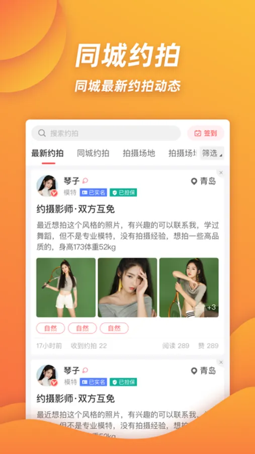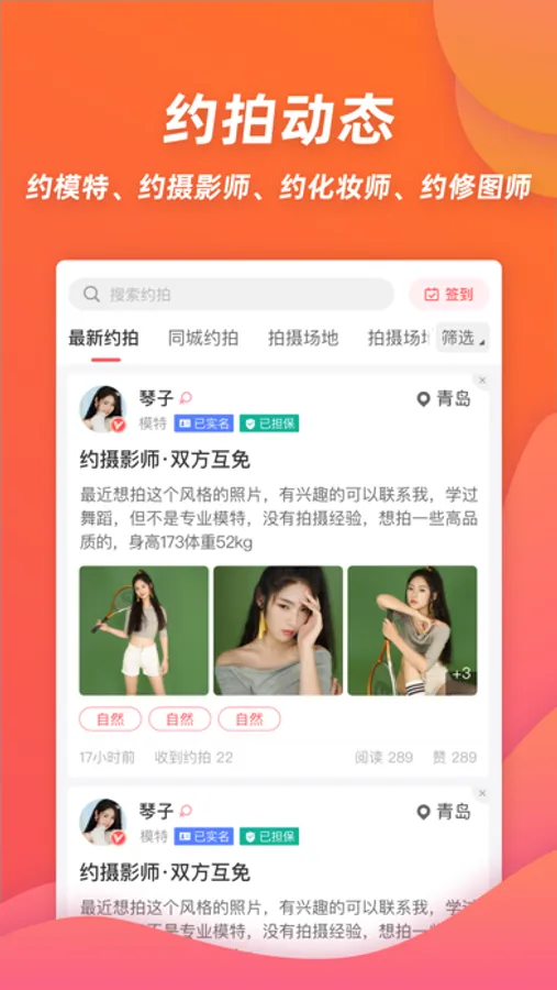 【约拍动态】你可以在线发布约拍动态,寻找想合作的人。动态内容可以是你的约拍要求和个人作品或照片,有合作意向的人可以在线发起对你的约拍请求。