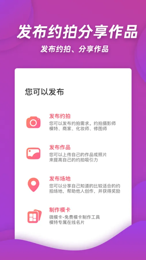 麻豆约拍是一款汇集模特、摄影师、商家、化妆师、造型师等人才的严肃靠谱约拍平台。有海量模特、摄影师等在这里一起约拍、一起创作。麻豆约拍能够帮助大家快速找到模特、化妆师、摄影师、修图师等,还能找到同城精选的摄影约拍场地。