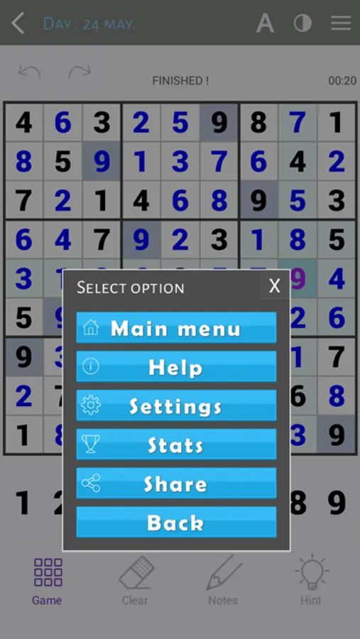 To solve the game you must complete the puzzle by filling in all the numbers (from 1 to 9) so that each digit does not repeat in the same row, column or block.