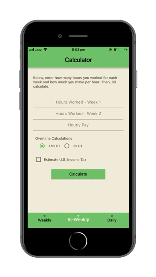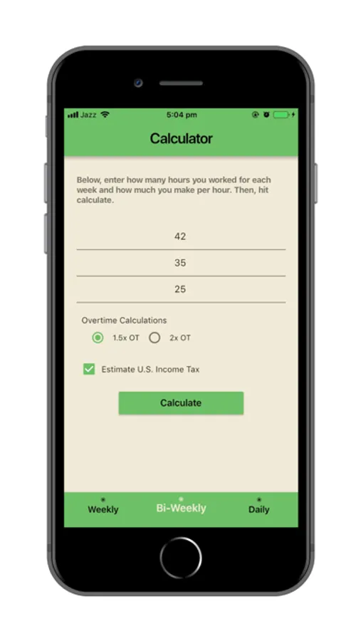 It's a simple calculator to figure out your overtime pay for the pay period. Just enter how many hours you worked and how much you make per hour to find out how much your overtime hours are boosting your check. There are 3 simple modes: weekly, bi-weekly and daily overtime.