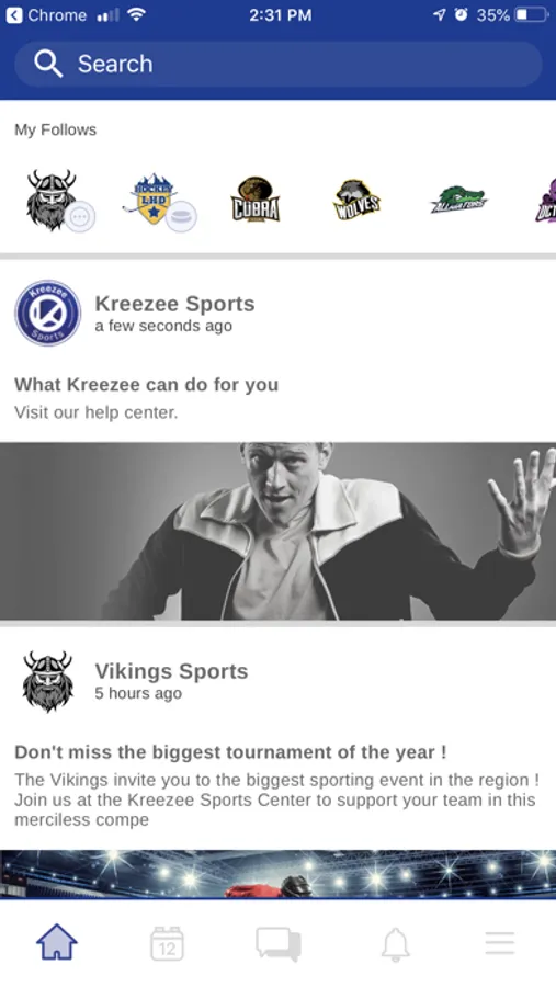With Kreezee Sports App, you can manage your sport team, follow any of your favorite sports organization member of the Kreezee community and get notification alerts to make sure you never miss the latest news and events regarding them.