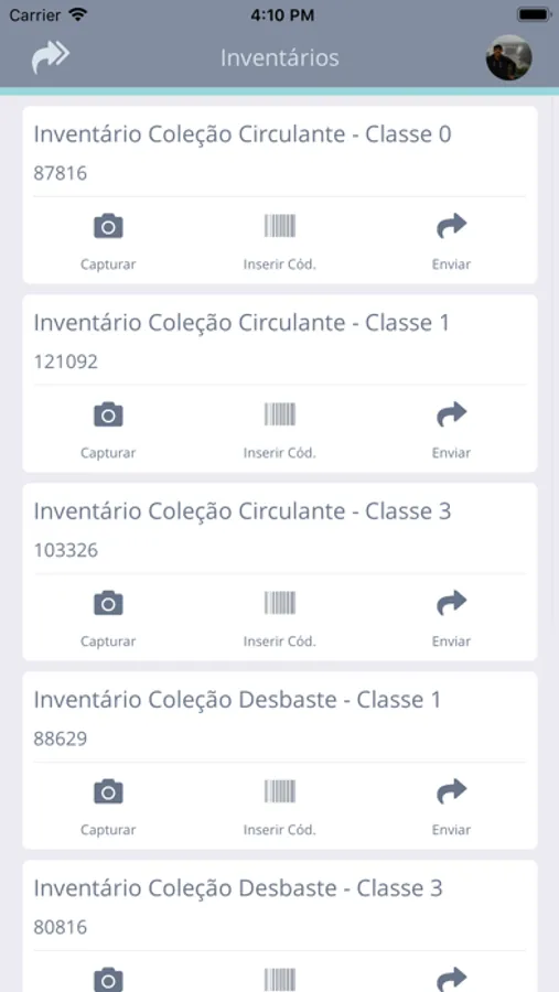 Na lista de inventários é possível selecionar o tipo de coleção e a classe desejada para efetuar o cadastro do livro.