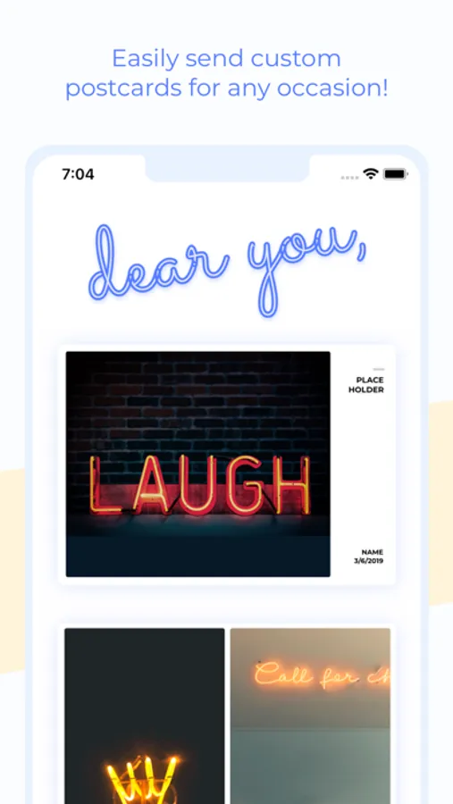 With Dear You, you can easily craft 6x4 postcards with your photos and text in beautiful fonts. We'll do the hard part of printing and mailing the postcard for you!