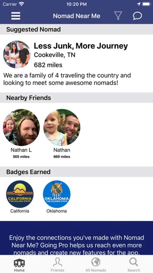 Nomad Near Me is your social network for travelers of all types from RVer's to car campers. Find new friends and get notified when old friends are near by.