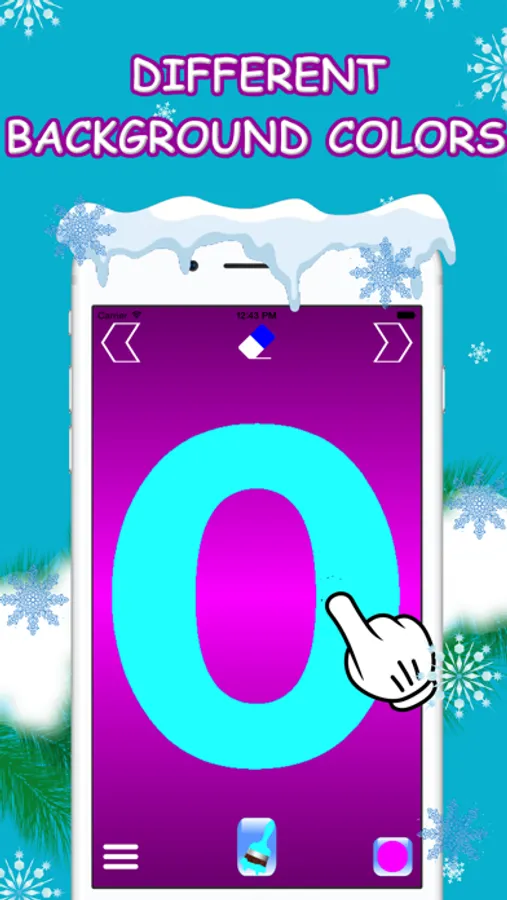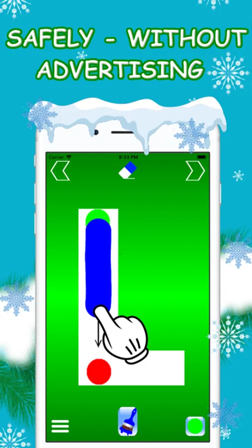 After the game is loaded, a large letter is written on the entire main screen so that it is easy for children to write, to drive a finger across the screen. To paint an element, you need to hold a green circle to red in the direction of the arrow without lifting your finger from the screen in one arrow direction. After successfully writing one element, the next element of the letter opens. and so on until the whole letter is written. Letters can be written in different colors; for this, the game provides for 6 brushes with different colors to choose from. You can also change the background color. Above the letter to the right and to the left there are two arrows; clicking on them scrolls the letter forward alphabetically or backward.