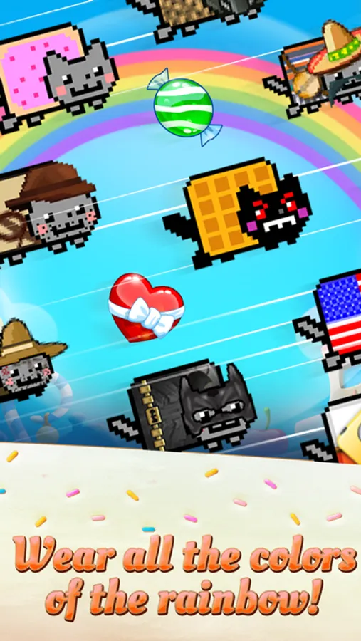 Enjoy the crazy colorful candy adventures of Nyan cat, featuring: