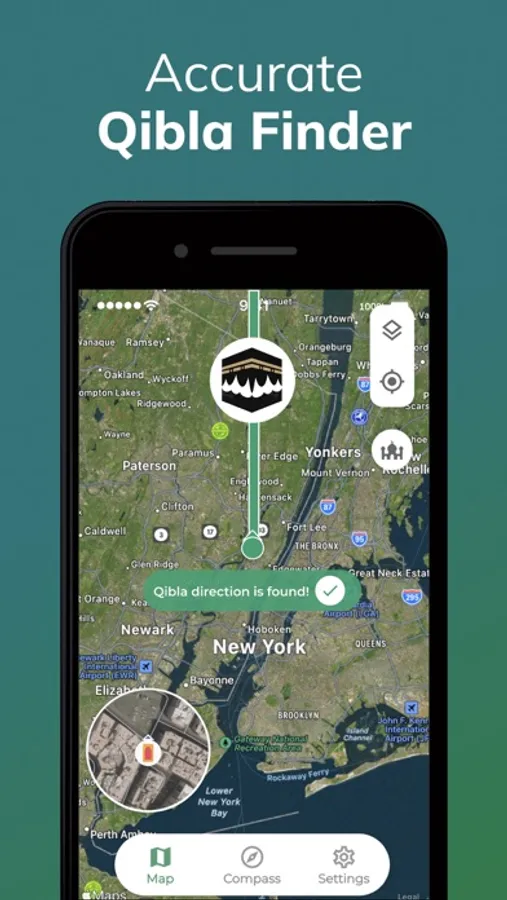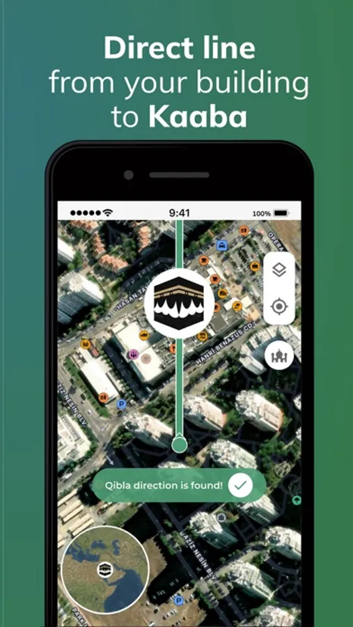 100% Qibla Finder helps muslims to find Qibla direction all around the World. The direction of Kaaba in Mecca (Makkah) is pointed out with an arrow on the map, so that you can adjust your direction before you start your prayer.