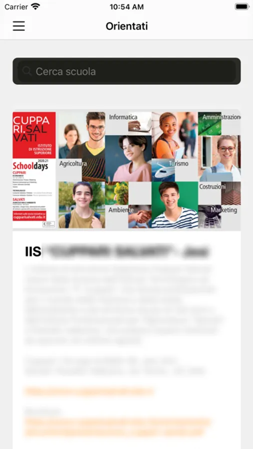 L’app, attraverso la sezione “Orientati”, permette di conoscere le caratteristiche delle scuole superiori di secondo grado delle zone di Jesi e di Fabriano. Per ogni Istituto vengono elencati tutti gli indirizzi di studio e tutte le articolazioni attive in quella sede. Una mappa indica dove è dislocata la scuola.