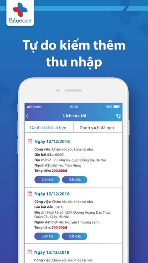 Bằng cách tham gia vào nền tảng “Bluecare – Hệ sinh thái chăm sóc sức khỏe toàn diện tại nhà” bạn sẽ giải được bài toán phức tạp là mong muốn được phát triển sự nghiệp bằng công việc chuyên môn yêu thích và cao cả của mình, được có thu nhập cao, được tự do, tự chủ về thời gian để có thể chăm sóc cho bản thân và gia đình. Sẽ có hàng nghìn bệnh nhân trên hệ sinh thái Bluecare cần bạn hỗ trợ chăm sóc sức khỏe tại nhà, thay băng cắt chỉ, thay đặt sonde, phục hồi chức năng, châm cứu bấm huyệt giúp họ nhanh chóng bình phục để trở lại với cuộc sống khỏe mạnh. Do đó khi bạn có thời gian và muốn có thêm thu nhập bạn chỉ cần mở ứng dụng ra, chọn một lịch đặt của bệnh nhân phù hợp, ở gần mình nhất để làm và kiếm tiền. Bạn có thể nhận thanh toán cho ca làm việc của mình hết sức đơn giản và linh hoạt, như nhận thanh toán bằng tiền mặt trực tiếp từ bệnh nhân, nhận thanh toán qua chuyển khoản, qua ví điện tử.