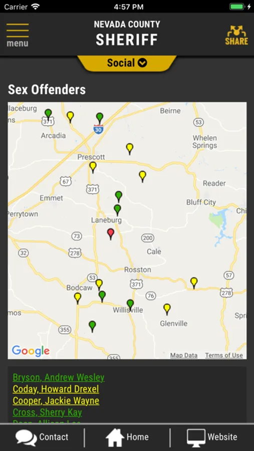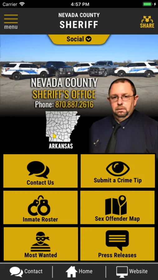 The app has public information for press releases, inmates, most wanted and sex offenders. Crime tips and contact us messages can be sent to the S.O.