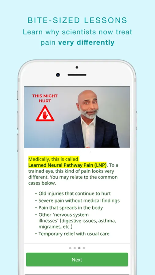 "The app is intuitive and well organized. It explains the latest science on chronic pain in an easy-to-understand way and provides practices that are well designed to manage your pain. I used the app daily -it was like having a coach right by my side, guiding me along the way. Together w/the program, I was able to wash dishes and swim without pain for the first time after six years of chronic pain."