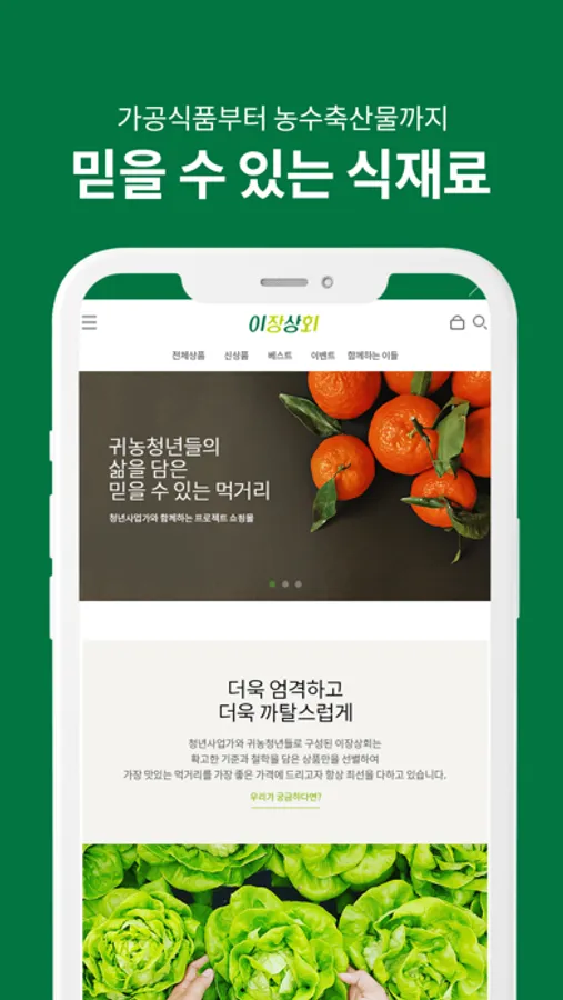 각 지역의 농부들과 생산자들이 생산하는 좋은 먹거리는 많지만, 상품을 판매할 방법이 없어 판매를 못하는 소농, 소기업들의 철학과 스토리가담긴 상품을 판매하기 위해 이장상회는 만들어졌습니다.