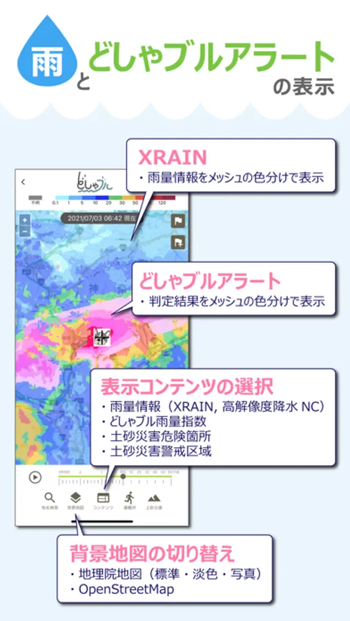 「どしゃブル」は、リアルタイムの雨量情報である国土交通省の「XRAIN」と、これに基づき算定した土砂災害の発生と関係のある「どしゃブル雨量指数」(【3】参照)などを地図上に表示するとともに、地点や時間を指定して降雨状況を表示するアプリです。